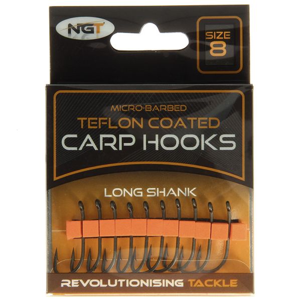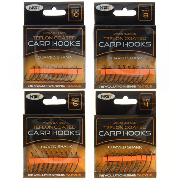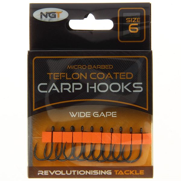 A pack of 10 micro barbed super strong Teflon coated carp hooks. Available in sizes 4, 6, 8 and 10 in models Curved Shank, Long Shank and Wide Gape.