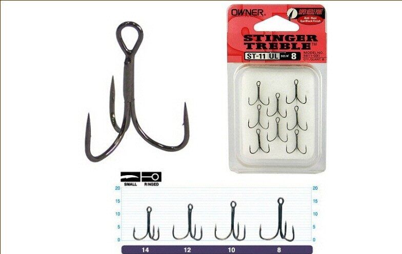 The Owner ST-11 UL Treble Hooks have an anti-corrosion black chrome coating. Fine micro counter providing good penetrating ability. Ear in a teardrop shape. Suitable for fishing with live bait or when replacing triplets with lures and wobblers with smaller sizes.