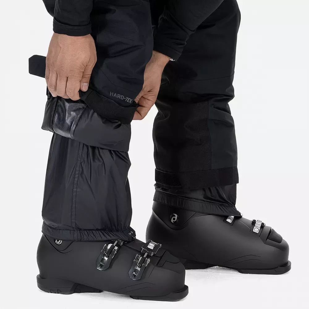 • Sniega aizsardzības getras un cilpa ar spiedpogu bikšu staru apakšdaļā savienošanai ar zābaku neļauj sniegam iekļūt iekšpusē.
