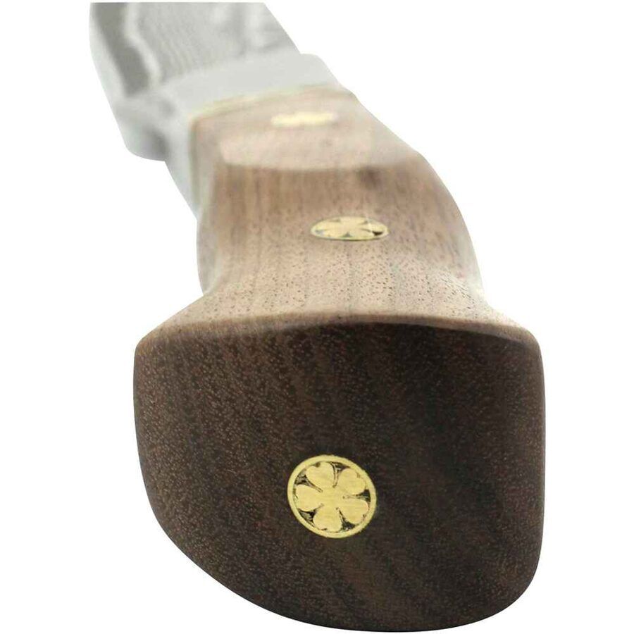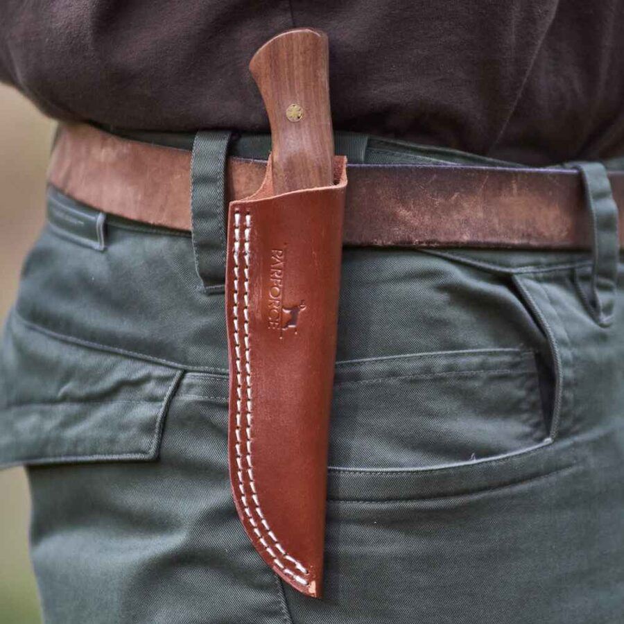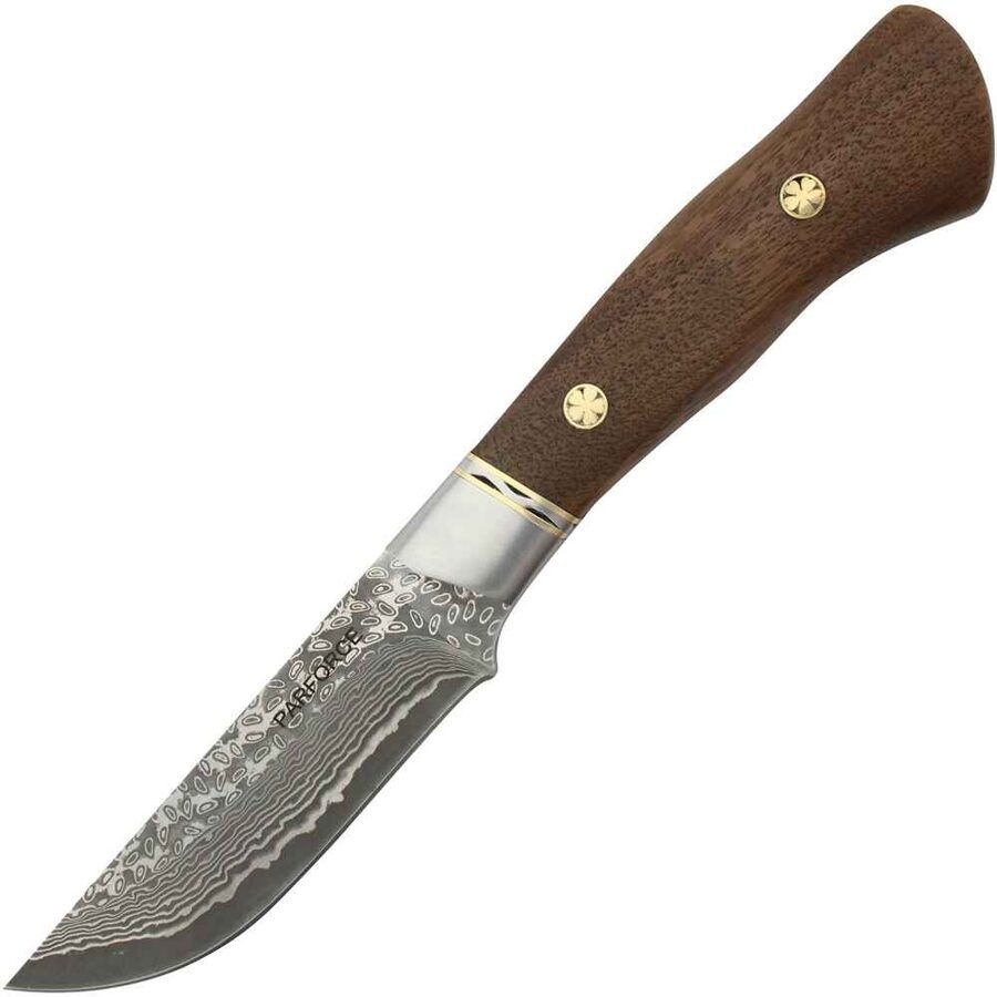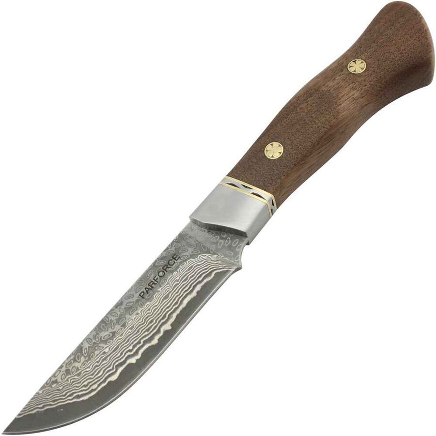 PARFORCE damaska nazis ir skaists medību nazis ar neparastu dizainu. Spals ar serdi, kas izgatavota no 9Cr18MoV tērauda malu saturoša, abās pusēs lietus lāses veidā ir kaltas 67 damaska kārtas. Rokturis, kas izgatavots no valriekstu koka, ir ieeļļots un ar satīna matētu apdari un, pateicoties neparastajai formai, ērti ieguļas rokā. Mozaīkas tapas āboliņa lapu dizainā no veiksmes pļavas āboliņa piešķir nazim pievilcīgu izskatu. Nazim ir brūna ādas maksts ar plašu jostas cilpu un kontrastējošu šuvi.