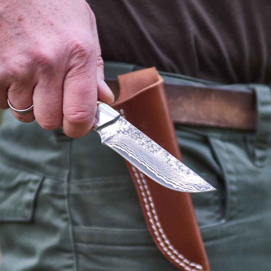 Lielisks komplekts - Damaskas nazis, ādas ietvars ar jostas stiprinājumu un viss iepakots skaistā kastītē. Ideāla dāvana katram medniekam.