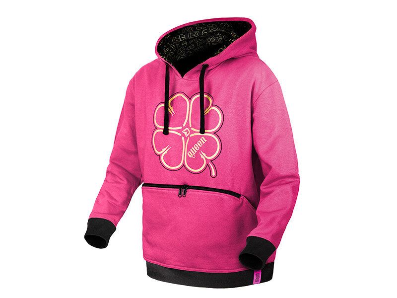 The hoodie has a big closing pocket in front with a quality double zip. The side pockets will keep you warm in colder weather. The hood is pink from the outside and black from the inside with Delphin logos and yellow four-leaf clover. Plus, it has a black drawstring. The hoodie has a close-fitting elastic waist and cuffs.