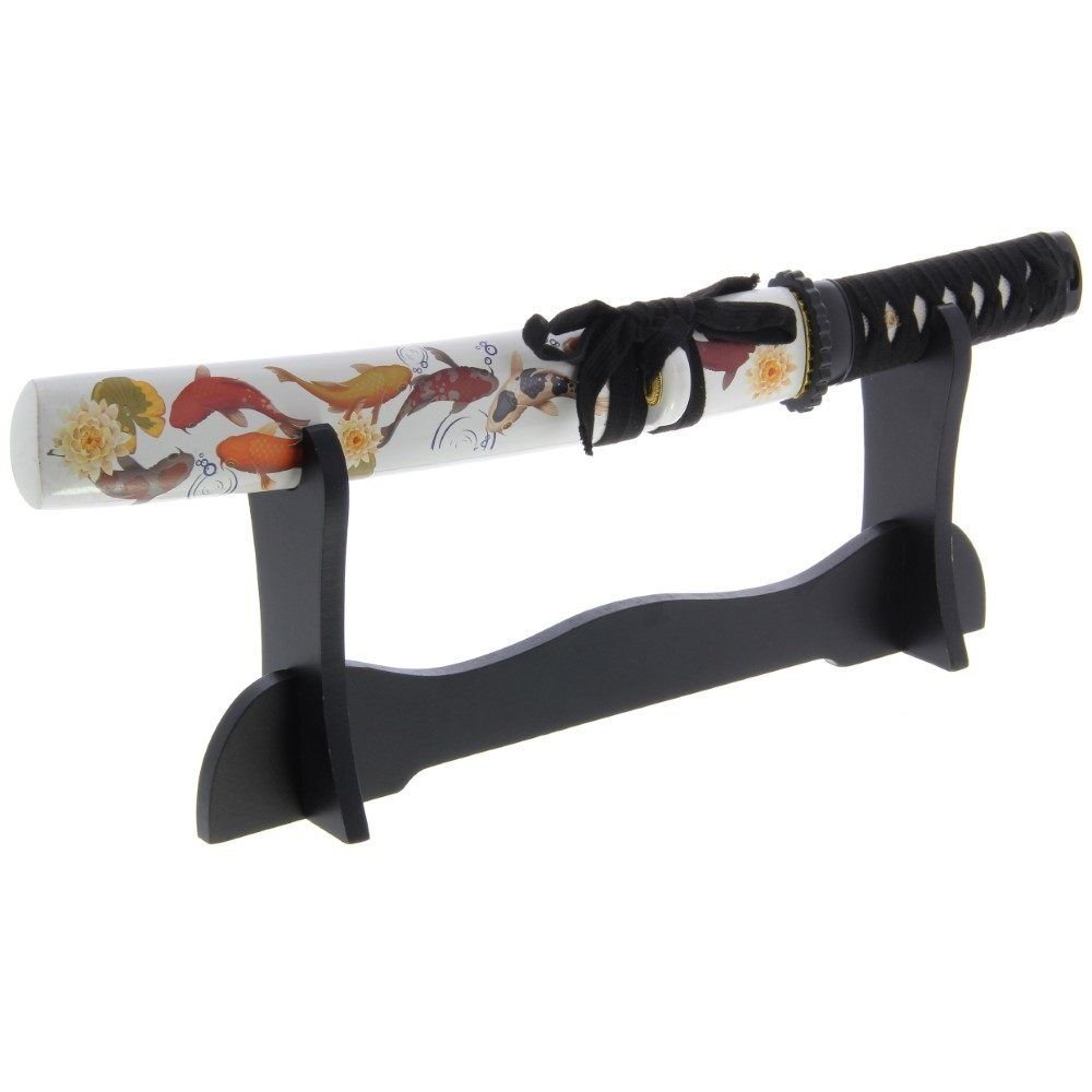 Skaists ar rokām darināts zobens ar baltu makstiņu ar “Koi” apdruku, ar auduma futrālīti un vienu koka statīvu.
