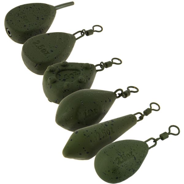 2.50oz leads with a dark green, soft touch, non reflective coating with black 'splash spots' and size 8 swivel . Available in the follwoing models;