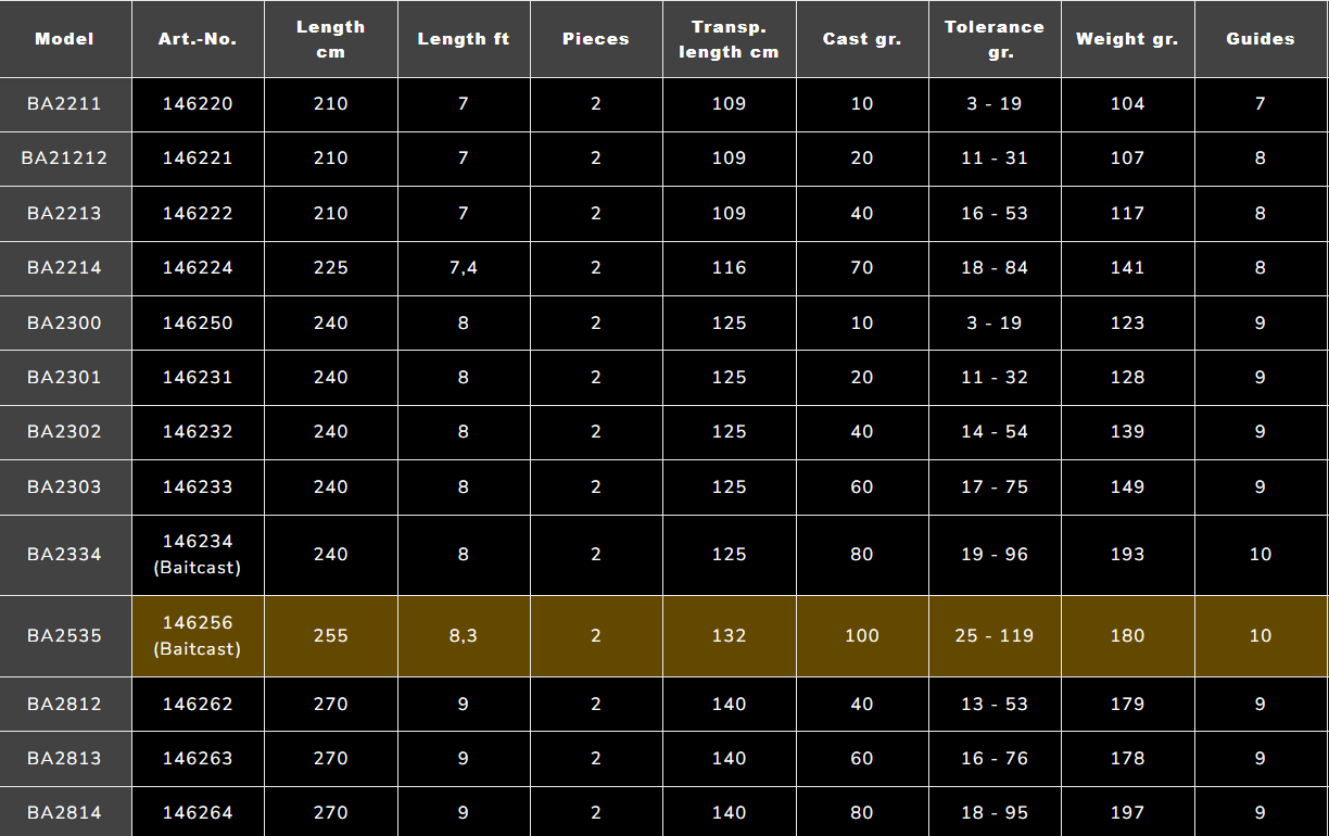 Unleash your fishing potential with our state-of-the-art 4th generation ‘Black Arrow’. The lightweight and powerful Helicore blank made of T800 carbon offers outstanding fishing fun and reliability. The ‘fast’ action of the blank is ideal for use with hard and softbaits and ensures precise lure control and outstanding reaction speed. Due to its impressive speed and excellent casting properties, this series once again provides an aha effect in terms of casting accuracy and range. The rods are equipped with slim SEAGUIDE SIC guides, a ‘grippy’ ergonomic EVA ‘split’ rear handle with an aluminium end cap. In addition, the lacquered FUJI TVS reel seat or the ACS reel seat on baitcast models and the heavy bigbait musky models ensure a secure hold of the reel and a consistent, stylish design. The two ‘Street’ models also have a telescopic rear handle, which provides additional flexibility when adjusting the length. This predator rod series combines state-of-the-art technology with outstanding design.