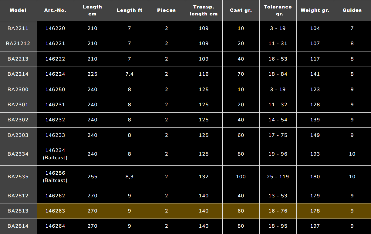 Unleash your fishing potential with our state-of-the-art 4th generation ‘Black Arrow’. The lightweight and powerful Helicore blank made of T800 carbon offers outstanding fishing fun and reliability. The ‘fast’ action of the blank is ideal for use with hard and softbaits and ensures precise lure control and outstanding reaction speed. Due to its impressive speed and excellent casting properties, this series once again provides an aha effect in terms of casting accuracy and range. The rods are equipped with slim SEAGUIDE SIC guides, a ‘grippy’ ergonomic EVA ‘split’ rear handle with an aluminium end cap. In addition, the lacquered FUJI TVS reel seat or the ACS reel seat on baitcast models and the heavy bigbait musky models ensure a secure hold of the reel and a consistent, stylish design. The two ‘Street’ models also have a telescopic rear handle, which provides additional flexibility when adjusting the length. This predator rod series combines state-of-the-art technology with outstanding design.