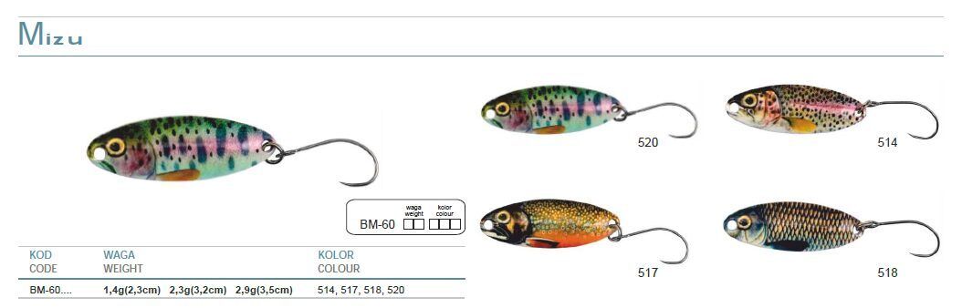 Šūpiņš ezeriem un upēm. Lieliski darbojas arī lēnā vilkšanā. Pateicoties ļoti reālistiskajam apdrukai, tas pamudina uzbrukumam pat vispiesardzīgākos plēsējus. Piemērots lašveidīgo zivju, asaru un sapalu makšķerēšanai. Svars: 1,4 g (2,3 cm).