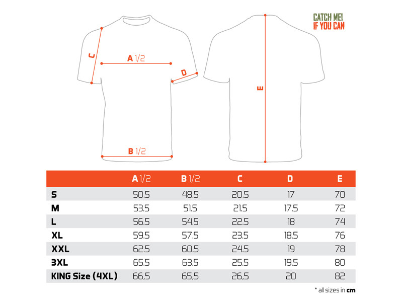 Pats T-krekls ir augstas kvalitātes, tāpat kā apdrukai izmantotā krāsa. Mēs tos piedāvājam plašā izmēru diapazonā no S līdz KING SIZE (kas atbilst 4XL+, lielākajā daļā valstu to apzīmē kā XXXXXL). King Size modelis viegli derēs pat lielākajiem makšķerniekiem, kas sver 135 kg un vairāk.