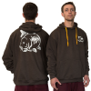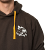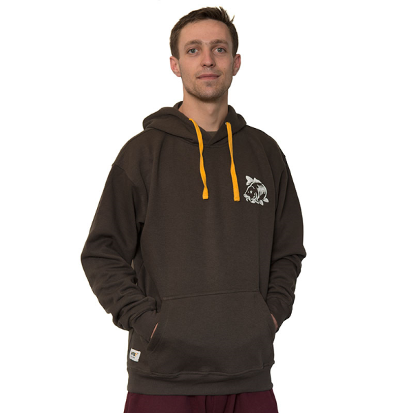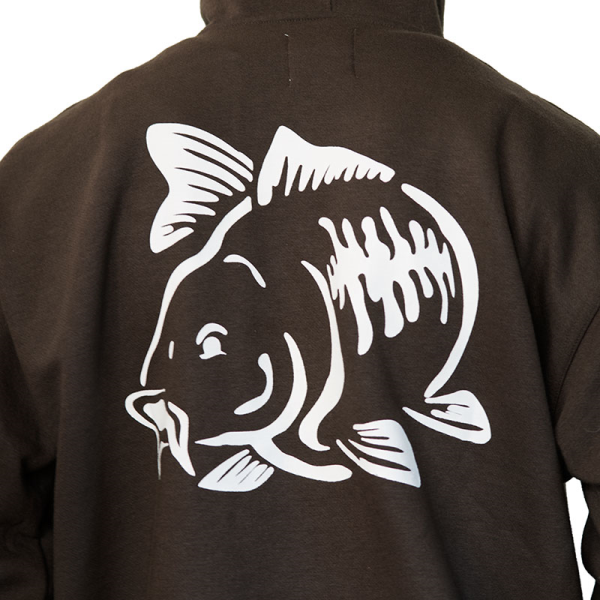 A 60% Polyester / 40% cotton olive green hoodie with carp emblem on the breast and back.