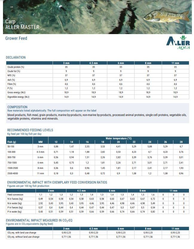 Aller Master granulām ir nedaudz zemāks olbaltumvielu un eļļas līmenis nekā Aller Best granulām, taču tās joprojām satur daudz enerģijas un saglabā augstu pievilcības līmeni zivīm.