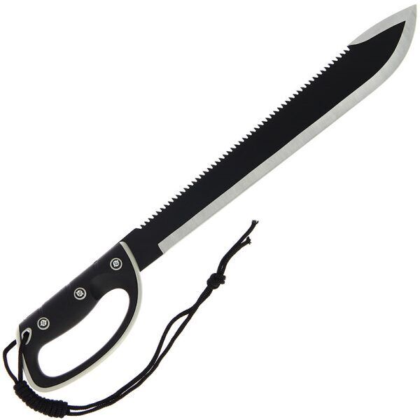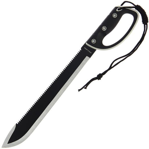 Neticami augstas veiktspējas mačete no Anglo Arms! Šai pavisam jaunajai mačetei ir 15" jeb 38cm asmens ar melnu pārklājumu un satinētu virsmu. Tā ir aprīkota ar nolaistu gala asmeni ar pilna garuma zāģa aizmugurējo daļu, kas stiepjas pa visu asmens garumu.