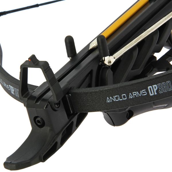 80 lb Anglo Arms 'OP-360' cietās sveķu plastmasas pašuzvilkšanās arbalets ar regulējamu taktisko rokturi un plecu daļu. Komplektā ar 3 alumīnija bultām.