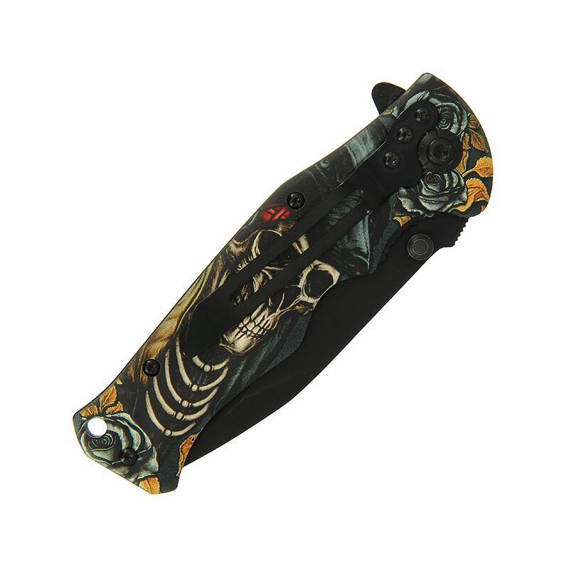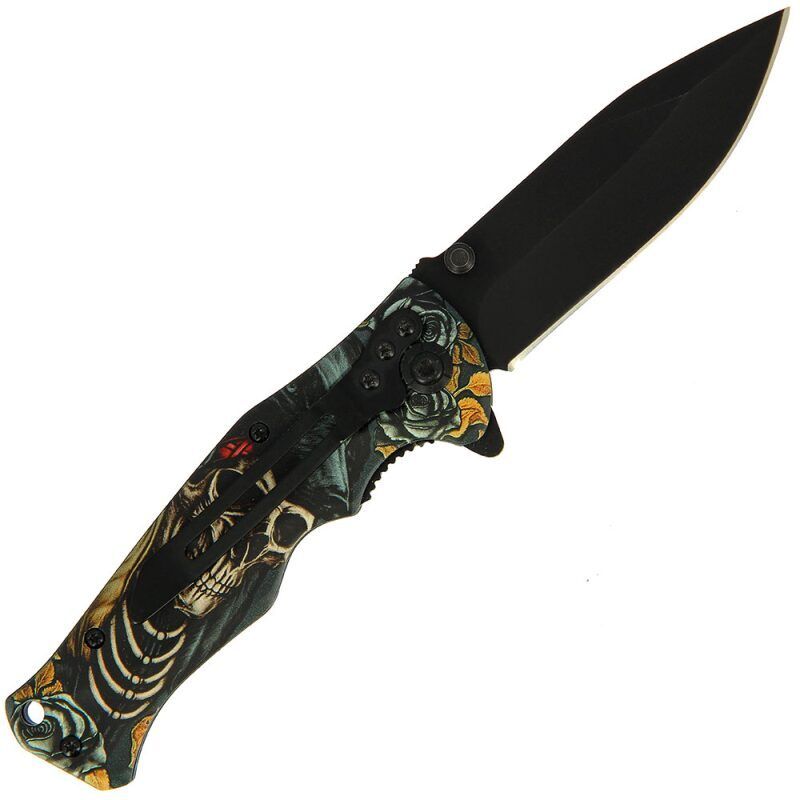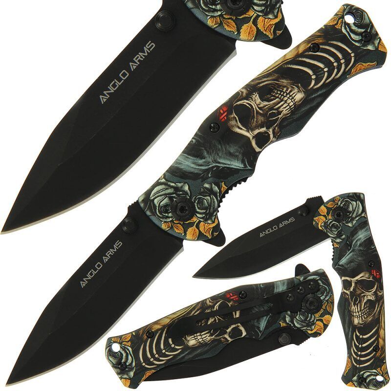 Anglo Arms Lock Stila slēdzamais nazis ar galvaskausiem un rozēm.