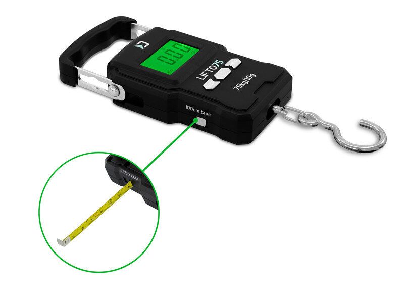 If there is a perfect weight for an angler, it is definitely LIFTO! This rechargeable digital scale allows you to measure weights from 10g up to 75kg with high accuracy. LIFTO is easy to operate with three buttons. The scale is switched on or off by pressing the middle button Power ON. By shortly pressing the UNIT button it‘s possible to change the units of weight (kg, lbs, JIN, oz) shown on the display. The fourth press of the UNIT button switches the scale to thermometer, that will show the current temperature in °C. You can turn off the display backlight on a bright day by holding the UNIT button for 2 seconds to save battery. The TARE function allows you to reset the weight on the hook, which is convenient for weighing fish without adding the weight of the weighing bag.