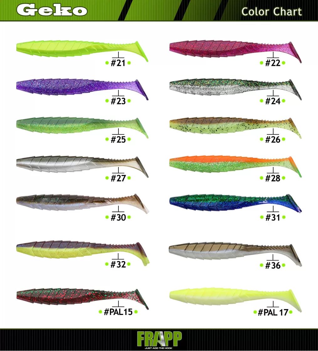 Frapp Geko silicone lure is a mid-proportions vibrotail with a characteristic "scaly" surface. The "heel" has a rounded, drop-like shape. When guiding, the Geko has a distinctly lively tail and there is practically no "rolling" - swaying around the longitudinal axis. Of the entire Frapp range of lures, this model is the most suitable for fishing on slow lines. It does not matter whether in the current or in stagnant water - the Geko goes into operation and plays stably at minimum speeds and allows the most delicate feed. The optimal choice for jig fishing in stagnant water and in slow current, even with minimal weight or even without additional burden.