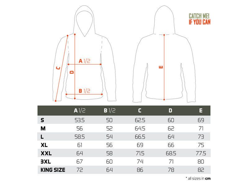 Sērija CATCH ME IF YOU CAN ar karpas attēlu ir neparasts gabals jūsu garderobē neatkarīgi no gadījuma. Karpas attēls ir attēlots kā skice, vienlaikus saglabājot visas detaļas, un tas iet apkārt viduklim apakšā. Tas parāda karpu, kas tuvojas boilām — tieši to brīdi, ko gaida katrs makšķernieks. Kapuce ir veidota tumši zaļā krāsā ar stilīgu oranžu un gaiši zaļu grafiku.
