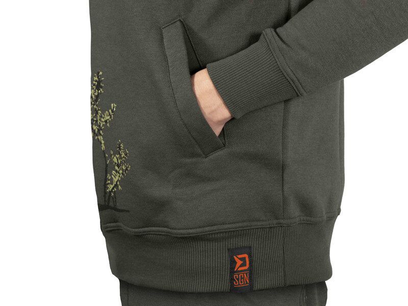 The series CATCH ME IF YOU CAN with an image of a carp is an unusual piece for your wardrobe, no matter the occasion. The image of a carp is depicted as a sketch while still maintaining all the details, and it goes around the waist at the bottom. It shows the carp getting close to the boilies—the exact moment every angler is waiting for. The hoodie is designed in dark green with a stylish orange and light green graphics.
