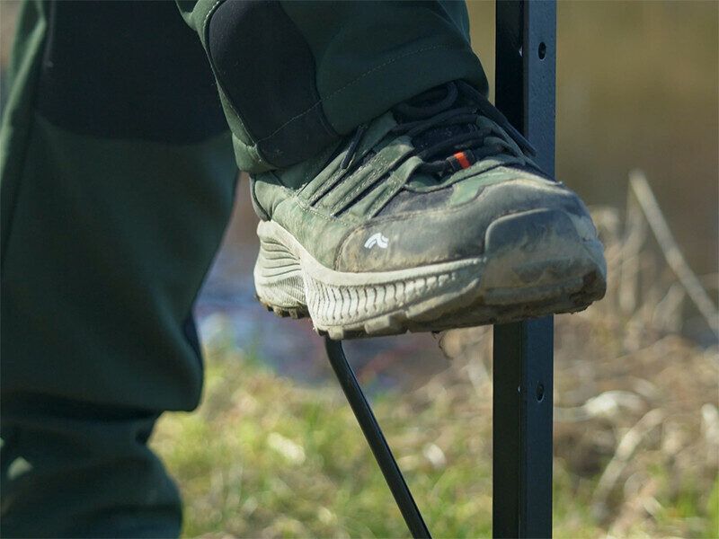 A robust structure is made of metal that’s resistant to elements and to mechanical damage. The lower part of the structure has a sharp spike to pierce it into a hard soil. For better manipulation, there’s a welded step to help you plant it to the ground.