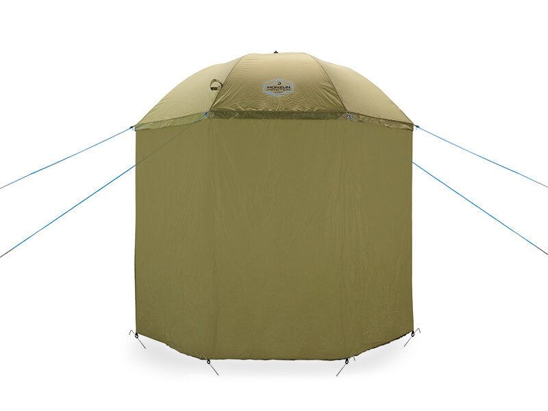 A premium umbrella Delphin MONZUN Master with sides that cover 3/4 of the space when the weather becomes far from ideal. It will protect you from direct sunlight, morning dew, and even heavy summer rain. Four guy ropes will prove useful during strong winds. The ropes are designed in a light blue colour to prevent tripping over them in low visibility. Umbrella seams are sealed with a waterproof tape to keep out 100% of the moisture during heavy rain. 3/4 of the umbrella have prolonged sides attached to the top by a quality zip. Lower parts of the sides are fitted with grommets that can be staked to the ground by pegs (the package contains 10 pegs). Zips are lapped to keep out the water. This umbrella can be tilted to better repel sunshine or wind. Because of its adjustable height, it’s easier to fix it in an uneven terrain or to adjust it to your own height. Delphin MONZUN is an exclusive umbrella for every occasion!