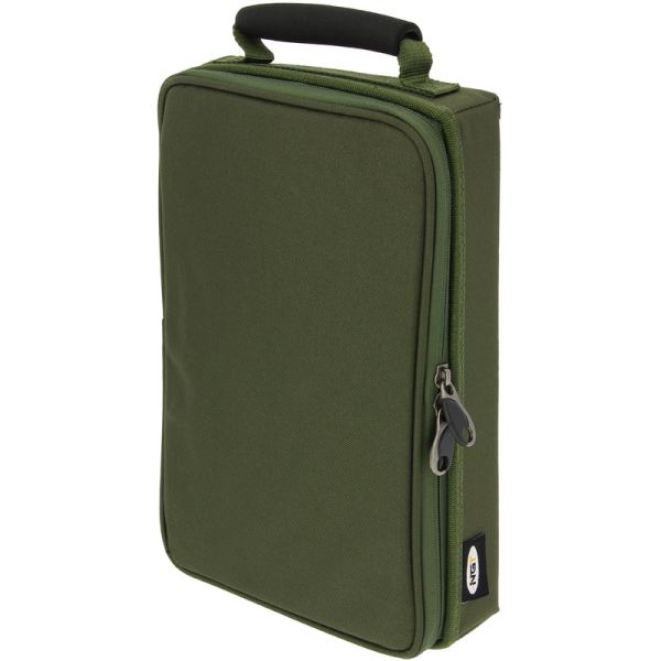 A multi-rig carp wallet. Features include 4 separate compartments, 4 mini terminal tackle boxes (included), detachable stiff rig board with pins, 2 pockets to store various items, an elasticated retainer for storing baiting needles and a super soft EVA handle for easy and comfortable transportation. (Made from 600D polyester with PVC backing.)