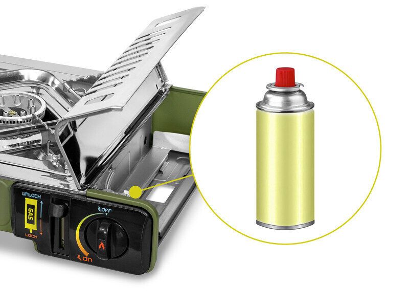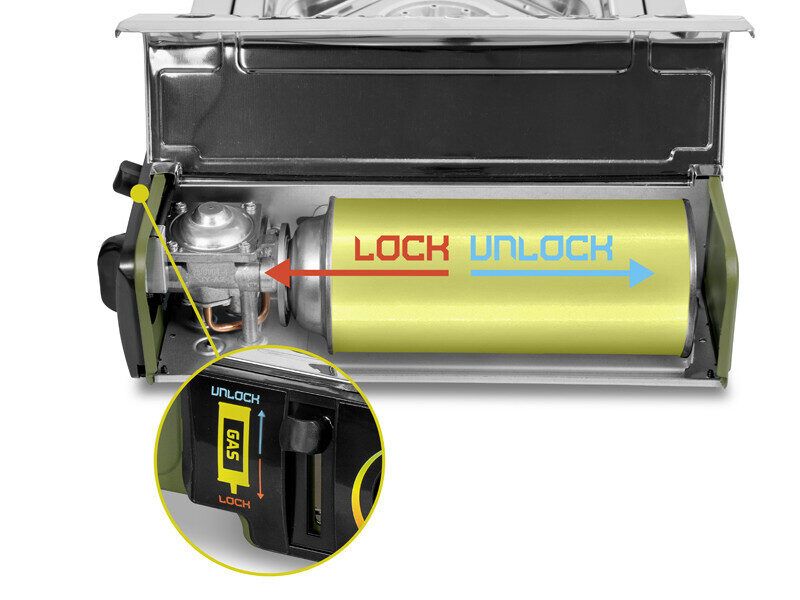 Plīts tiek darbināta ar CP250 tipa propāna-butāna patronām ar tilpumu 400 ml. Tai ir divpakāpju drošības sistēma, kas nodrošina maksimālu drošību lietošanas laikā. Lai aizdedzinātu liesmu, vispirms ir jānostiprina patrona, izmantojot sviru plīts priekšpusē. Tas ievērojami samazina nejaušas gāzes noplūdes vai automātiskas atbrīvošanas risku.