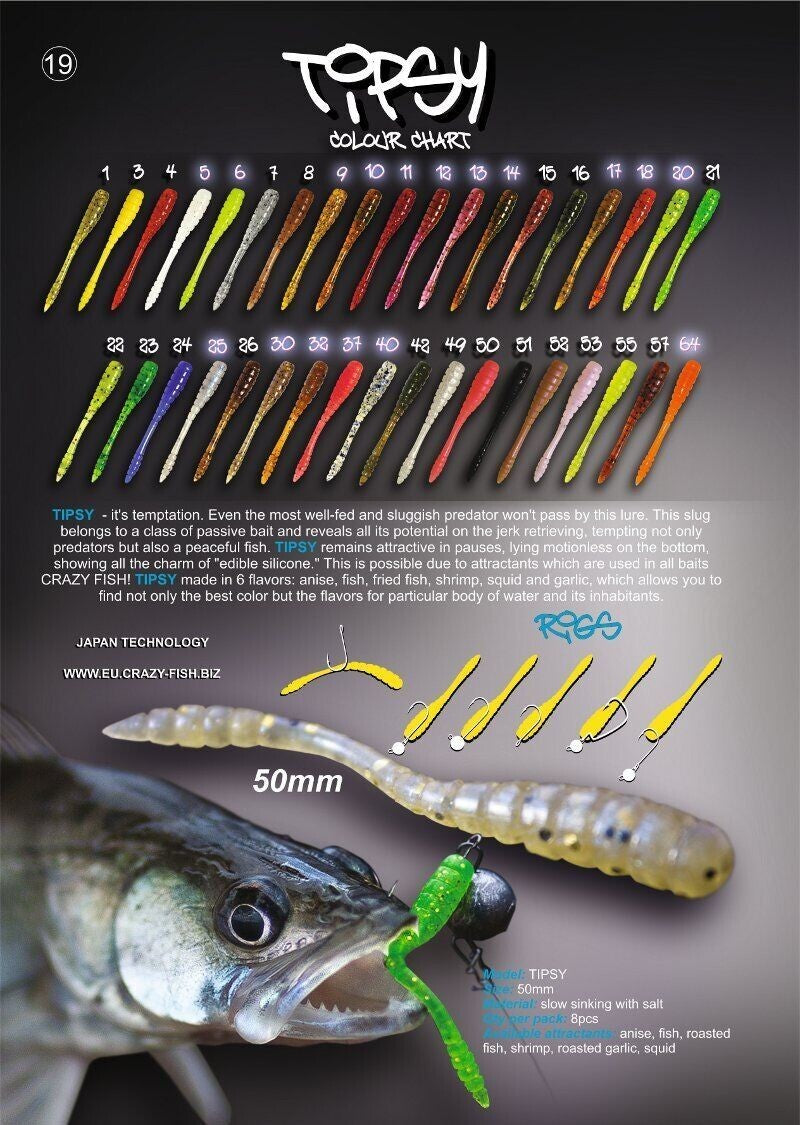 Crazy Fish Tipsy ir universāls, lēni grimstošs slug tipa mīkstais māneklis, kas nodrošina neatvairāmu kustību gan vienmērīgas ievilkšanas laikā, gan atstāts uz grunts — ideāli piemērots gan aktīvu, gan kūtru plēsēju ķeršanai.