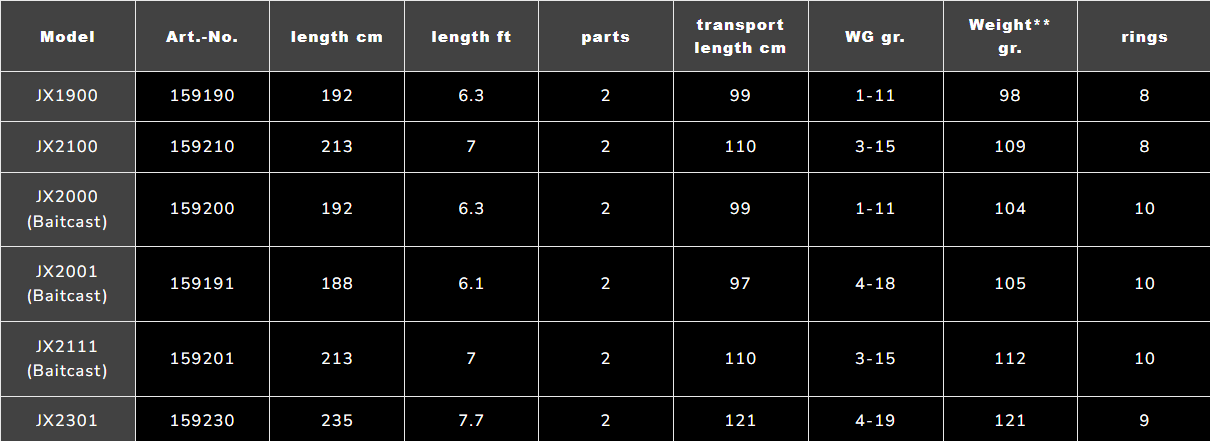 Šī iespaidīgā makšķerkātu sērija ir īpaši izstrādāta veiksmīgai mākslīgās ēsmas makšķerēšanai uz līdakām, zandartiem un asariem, aptverot visu mūsdienu aktīvās makšķerēšanas spektru. Visās iemetiena svara klasēs mēs piedāvājam ultimāto lomu mašīnu ar patiesu spēku Tavā plaukstā. Superātrais JIG-Xpert blanks, kas izgatavots no augstas veiktspējas Japānas oglekļa šķiedras, nodrošina izcilas iemetiena īpašības precīzai prezentācijai – pat īpaši tālos punktos.