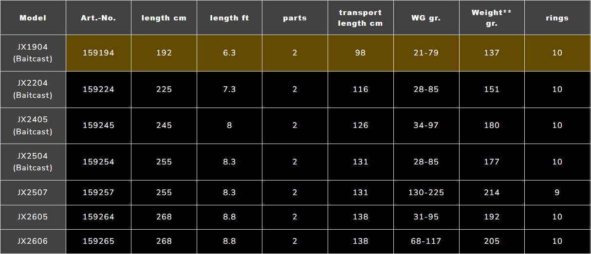 Pat lielo līdaku makšķerēšanas cienītāji novērtēs šīs sērijas iespējas! Ar JX2507 modeli mēs piedāvājam stacionāru risinājumu lielo mānekļu makšķerēšanai. Smagie gumijas mānekļi ar šo kātu lido tālu aiz horizonta, palielinot Tavas iespējas noķert trofejas zivis ar katru papildu metru!
