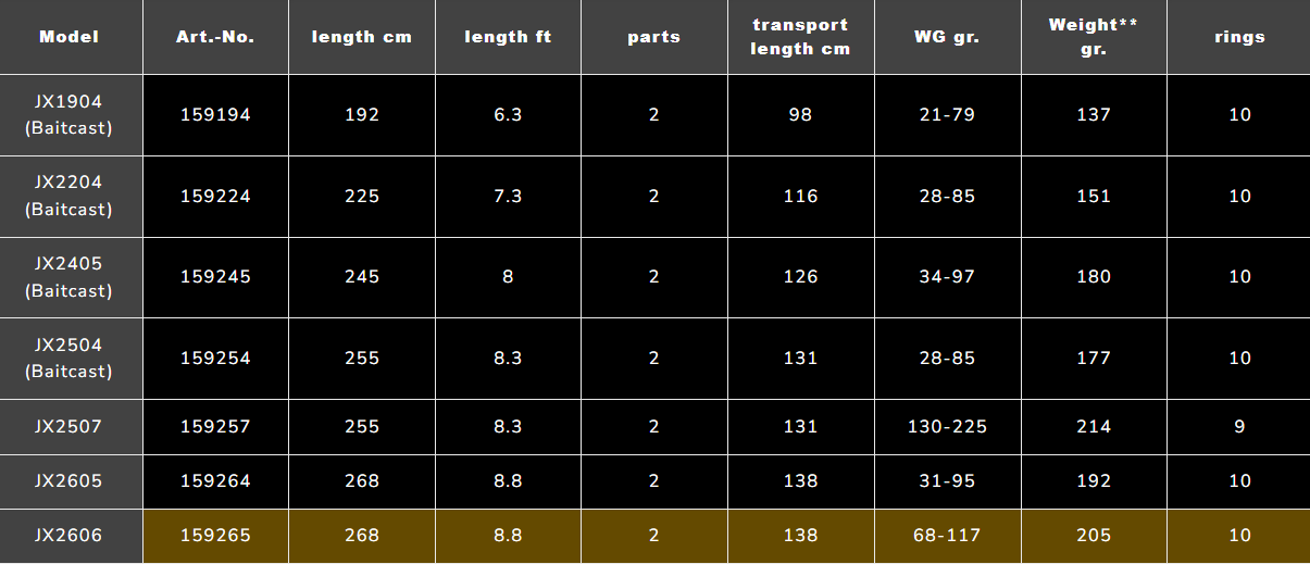 Pat lielo līdaku makšķerēšanas cienītāji novērtēs šīs sērijas iespējas! Ar JX2507 modeli mēs piedāvājam stacionāru risinājumu lielo mānekļu makšķerēšanai. Smagie gumijas mānekļi ar šo kātu lido tālu aiz horizonta, palielinot Tavas iespējas noķert trofejas zivis ar katru papildu metru!