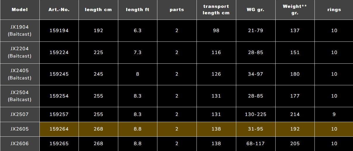 Pat lielo līdaku makšķerēšanas cienītāji novērtēs šīs sērijas iespējas! Ar JX2507 modeli mēs piedāvājam stacionāru risinājumu lielo mānekļu makšķerēšanai. Smagie gumijas mānekļi ar šo kātu lido tālu aiz horizonta, palielinot Tavas iespējas noķert trofejas zivis ar katru papildu metru!