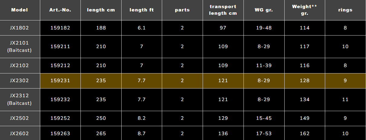 Šī iespaidīgā makšķerkātu sērija ir īpaši izstrādāta veiksmīgai mākslīgās ēsmas makšķerēšanai uz līdakām, zandartiem un asariem, aptverot visu mūsdienu aktīvās makšķerēšanas spektru. Visās iemetiena svara klasēs mēs piedāvājam ultimāto lomu mašīnu ar patiesu spēku Tavā plaukstā. Superātrais JIG-Xpert blanks, kas izgatavots no augstas veiktspējas Japānas oglekļa šķiedras, nodrošina izcilas iemetiena īpašības precīzai prezentācijai – pat īpaši tālos punktos.