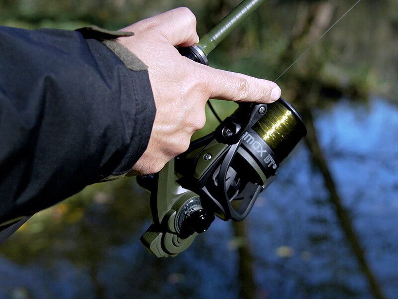 A quality metal bell and a thicker bail improve strength and durability. A thin metal handle has a dark wooden grip that fits right in the palm of your hand and looks very stylish. AMOX is designed in matte green and black, complemented by glossy parts, interesting carbon elements and stylish notches on the body of the reel.