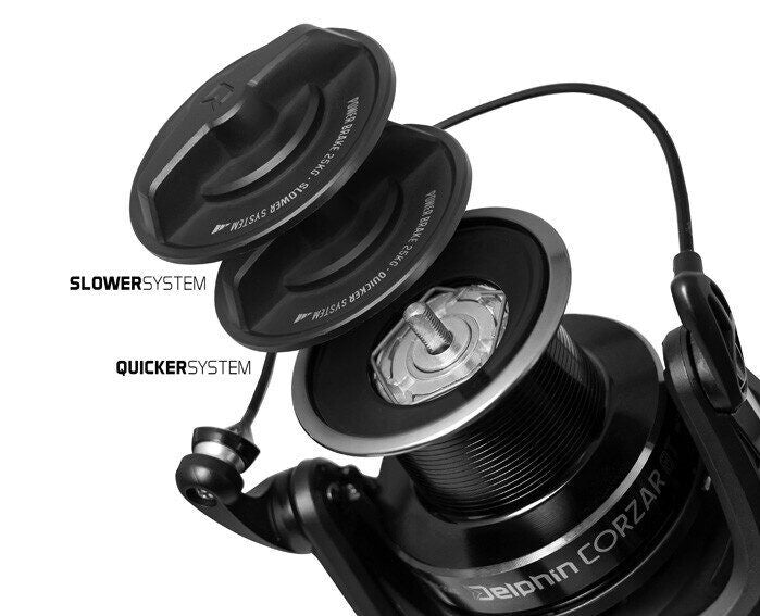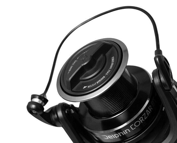 CORZAR belongs to the family of large-capacity carp reels from the Delphin brand, which excels with its elaborate design. Its base is a massive leg passing into the body made of very strong and durable plastic. Inside the reel, there is a worm shaft, which in combination with ball bearings (6+1) ensures trouble-free smooth running, and long life. The CORZAR is equipped with a so-called "power" brake, which has a braking force up to a respectable 25 kg and which you also receive with the reels in both sizes. The so-called brake "Quicker system" allows it to be fully tightened in one turn, while with the "Slower system" the braking of escaping fish is much smoother and slower. Together with the anti-reverse system, the CORZAR reel offers a wide range of power adjustment options when you are fighting a fish. Advantage of the reel is also the casting safety catch, which prevents the head from twisting unintentionally when the arc is tilted in a certain position and possibly tearing the line during casting. The metal spool can hold a large enough amount of line, which makes it a versatile reel for all types of water. Besides, the two brakes, the package also includes two spare screws for fixing the handle.
