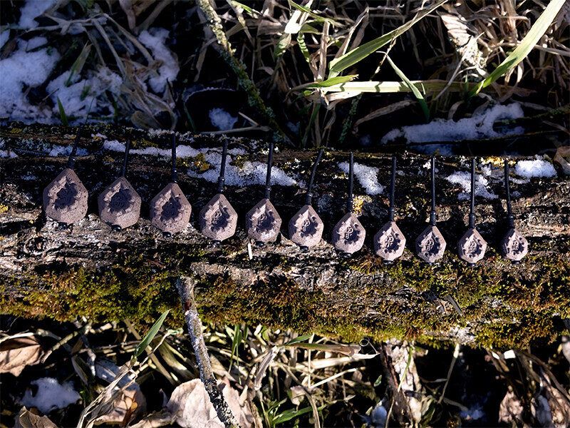 The surface of the sinker is coated in naturally-looking brown paint with black speckles for a better camouflage on the bottom. The notches on the surface grip the bottom and prevent it from gliding.