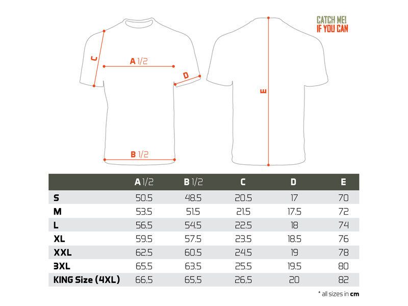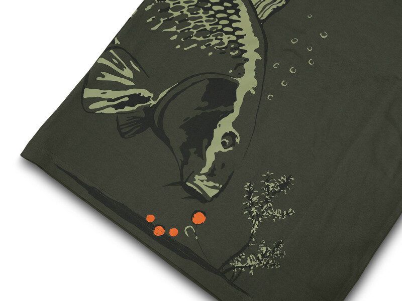 Sērija CATCH ME IF YOU CAN ar karpas attēlu ir neparasts gabals jūsu garderobē neatkarīgi no gadījuma. Karpas attēls ir attēlots kā skice, vienlaikus saglabājot visas detaļas, un tas iet apkārt viduklim apakšā. Tas parāda karpu, kas tuvojas boilām — tieši to brīdi, ko gaida katrs makšķernieks. T-krekls ir veidots tumši zaļā krāsā ar stilīgu oranžu un gaiši zaļu grafiku.
