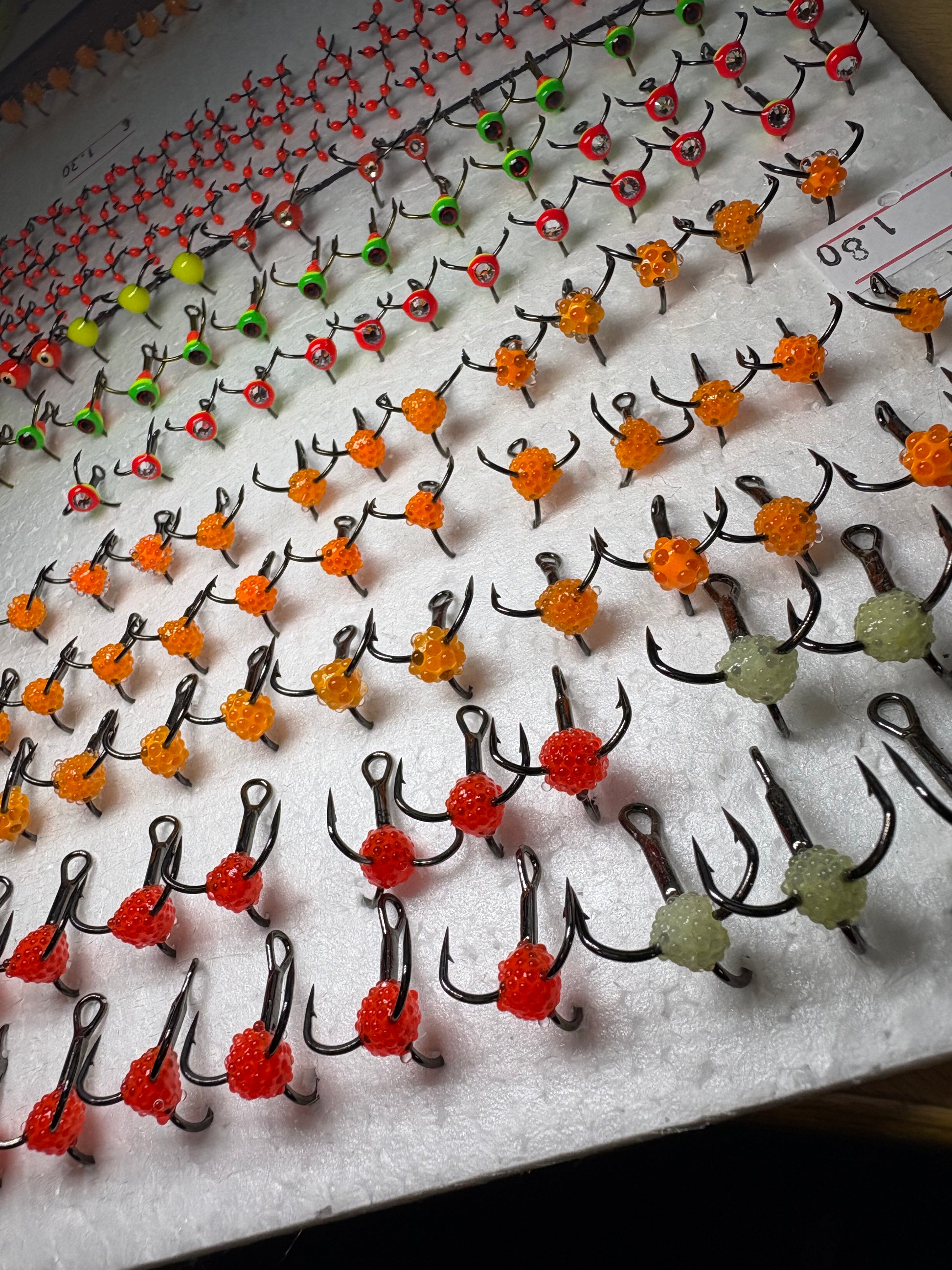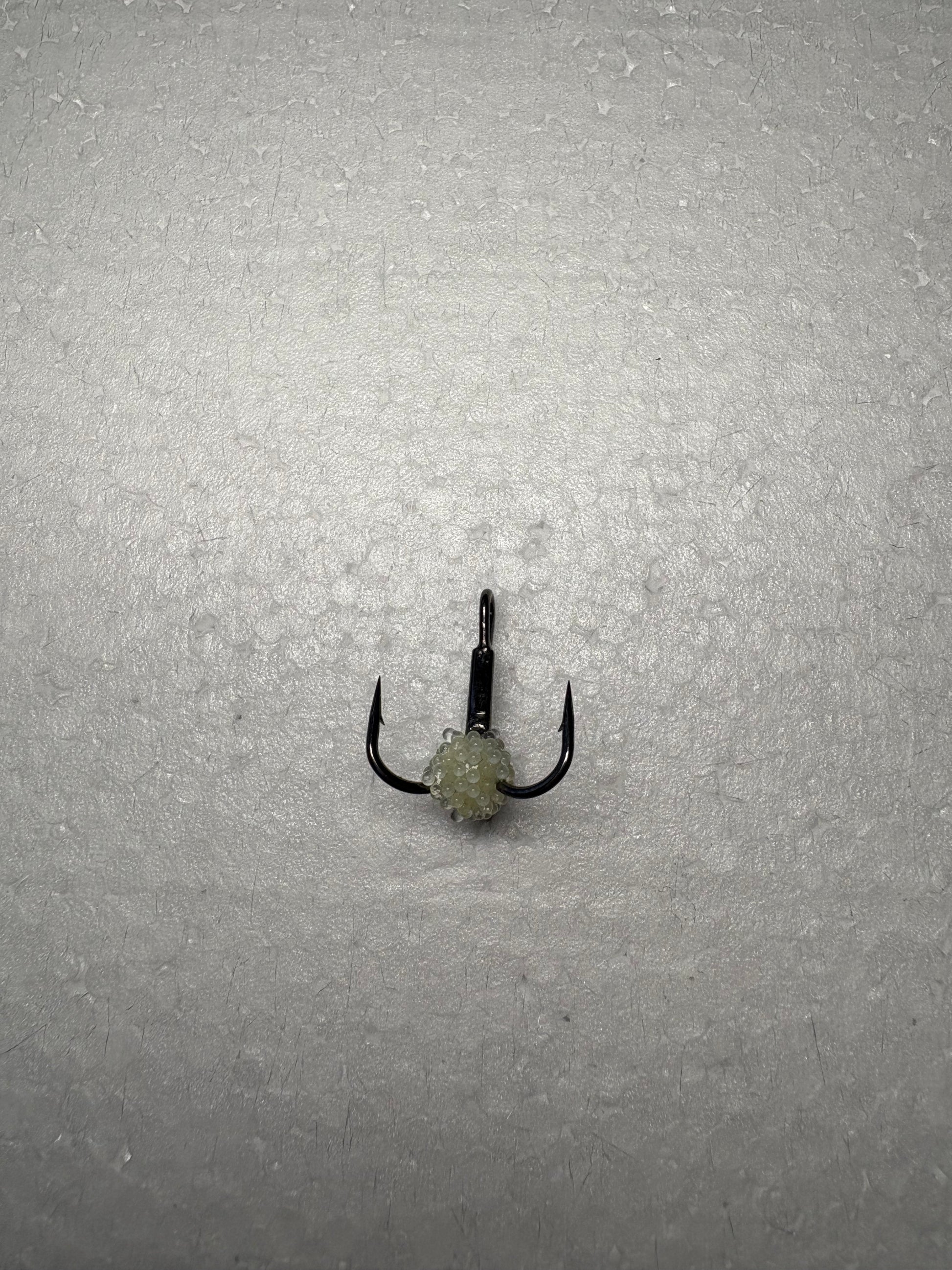 🎣 Trīsžubura UV āķi ar mākslīgām ikru bumbiņām — fosfarizēti