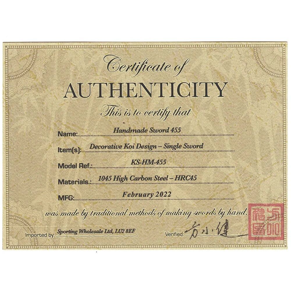 Iepriekšpasūtīšanai.Skaists ar rokām darināts zobens / katana ar "Koi karpu dīķa" apdruku un tumši zilu maksti, komplektā ar auduma futrālīti un vienu koka statīvu. Ar autentifikācijas sertifikātu.UZMANĪBU - Ļoti ass. Kopējais garums: 1020 mmAsmens garums: 720 mmAsmens materiāls: Materiāls: vidēja oglekļa tēraudsAsmeņa biezums: 72 mmAsmeņa cietība:: HRC 58Savienotājelementi Misiņš / cinka sakausējumsATĻAUTS IEGĀDĀTIES NO 18.GADU VECUMA!